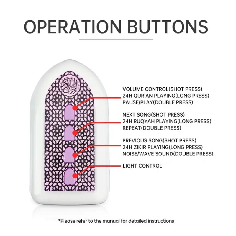 - Multi-function: Quran Learning/Loudspeaker/Night light/24-hour endless loop